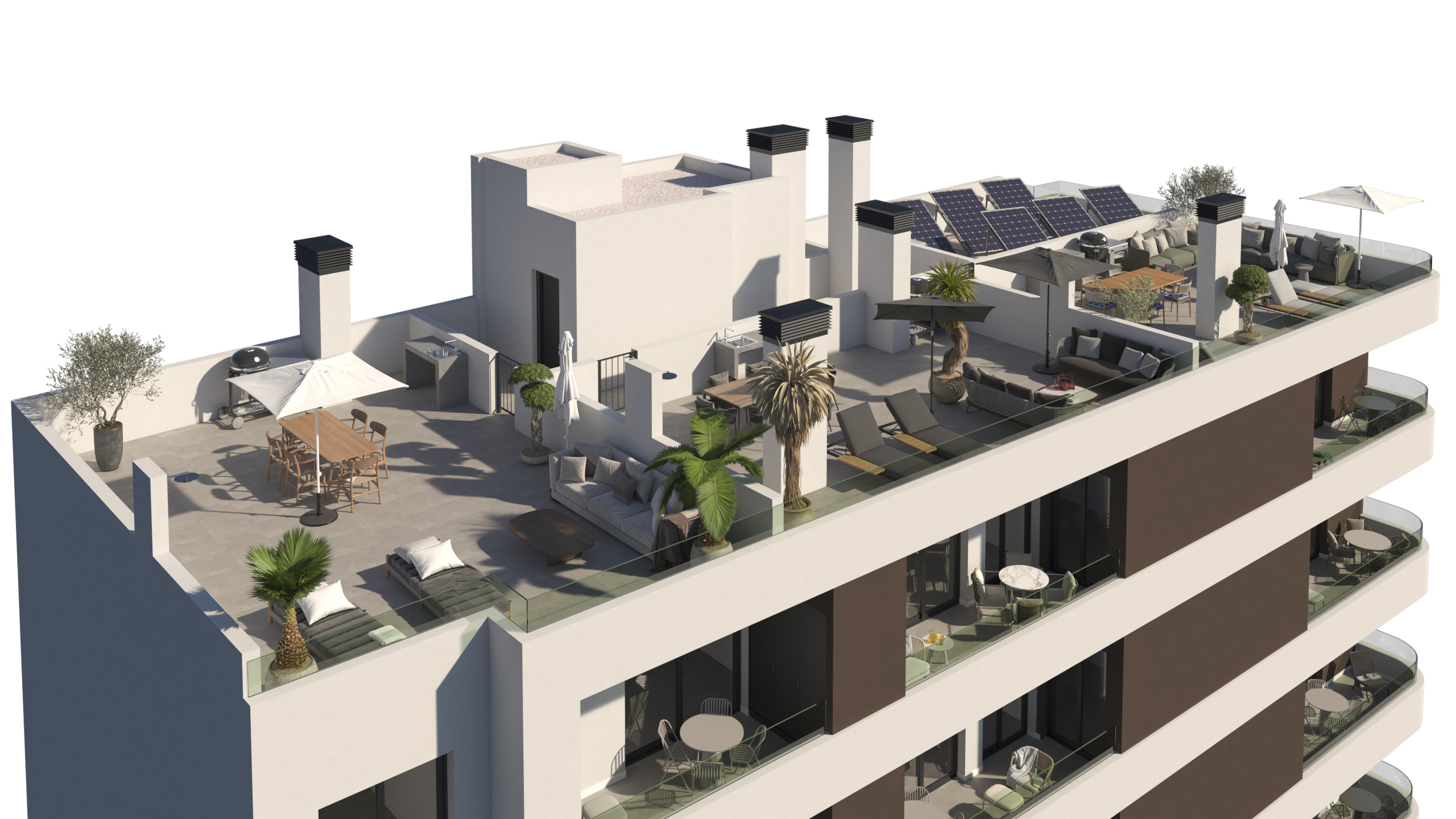 The penthouses have a generous solarium, with the option of adding a Jacuzzi and equipped with a barbecue, ideal for enjoying outdoor meals with guests throughout the year. It will also have a shower, as well as electricity and TV sockets, so you can install one and make the most of this space.